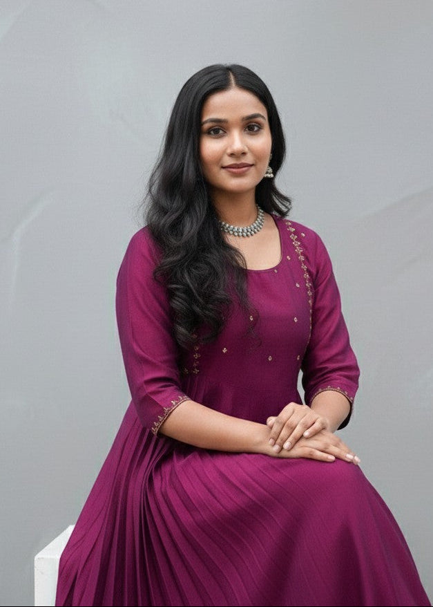 Elevate your ethnic wardrobe with our Radiant Magenta Hand-Embroidered Dress, a perfect blend of traditional craftsmanship and contemporary silhouette. This stunning ensemble is designed for the woman who loves understated luxury and effortless grace
