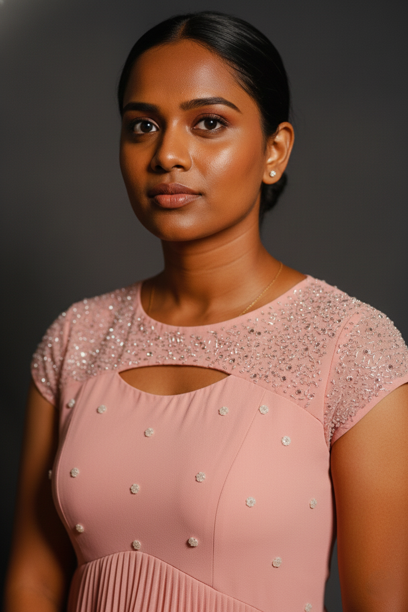 Turn heads at your next special occasion in our blush pink Georgette midi dress. This exquisite piece combines the airy, lightweight feel of premium georgette fabric with intricate, artisan-crafted details that elevate it from a simple dress to a statement piece.
