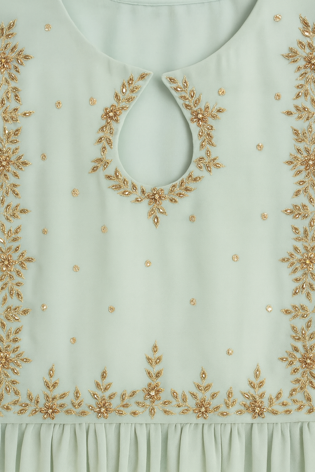 Elevate your evening wear with this stunning Georgette Pleated Dress. Featuring a handcrafted beadwork yoke, elegant keyhole neckline, and flowy micro-pleats.